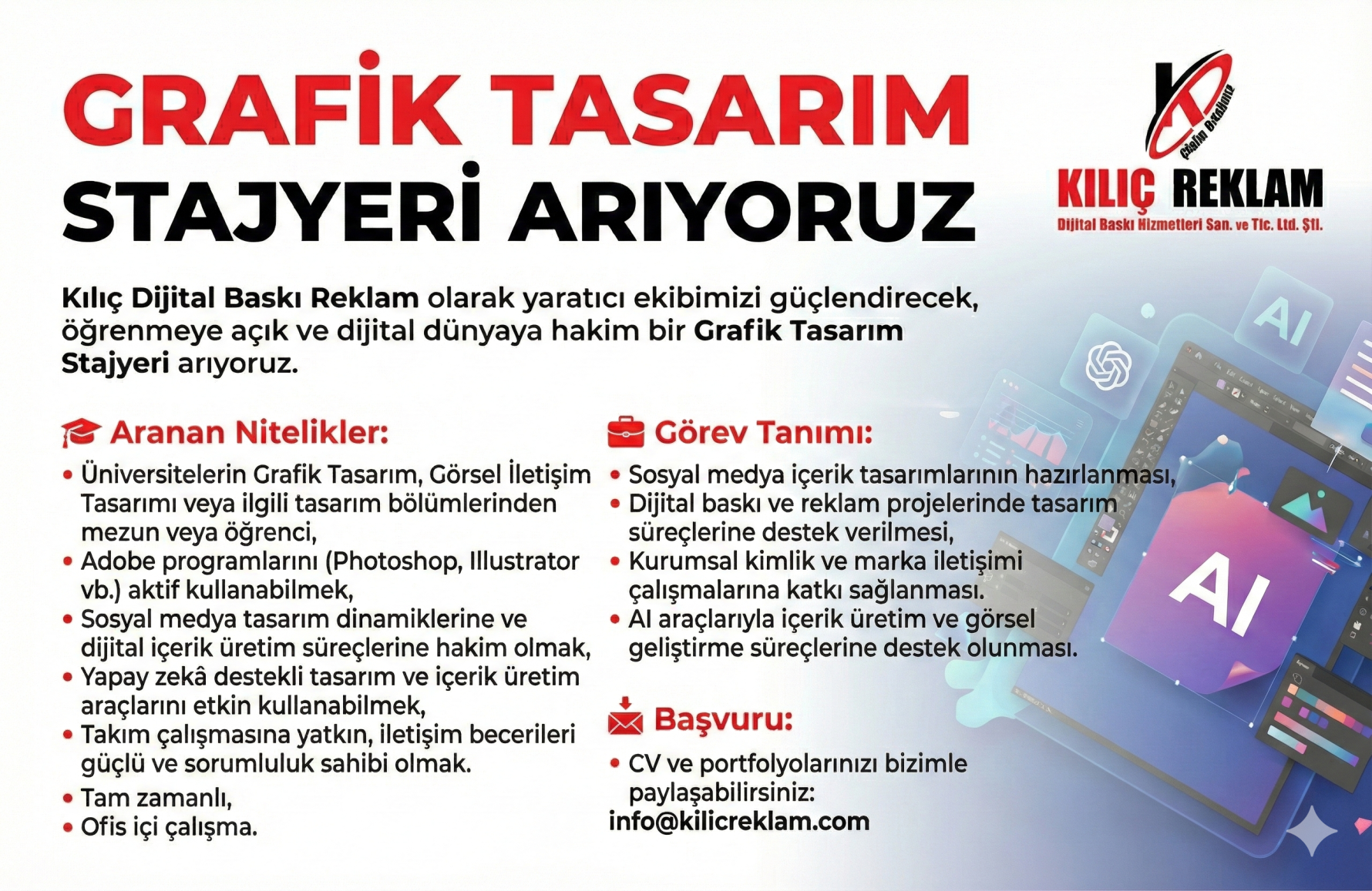 📩 Başvuru:CV ve portfolyolarınızı bizimle paylaşabilirsiniz info@kilicreklam.com